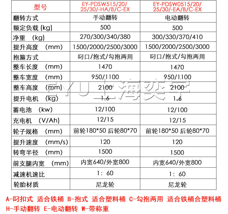 注:EY-PDS 是這個系列的型號 H-手動翻轉(zhuǎn) E-電動翻轉(zhuǎn) W-帶稱重 05代表500kg,15/20/25/30分別代表升高的高度1.5米 2米 2.5米 3米。 A-叼扣式 B-抱式 C-勾抱兩用 三種桶的夾緊方式