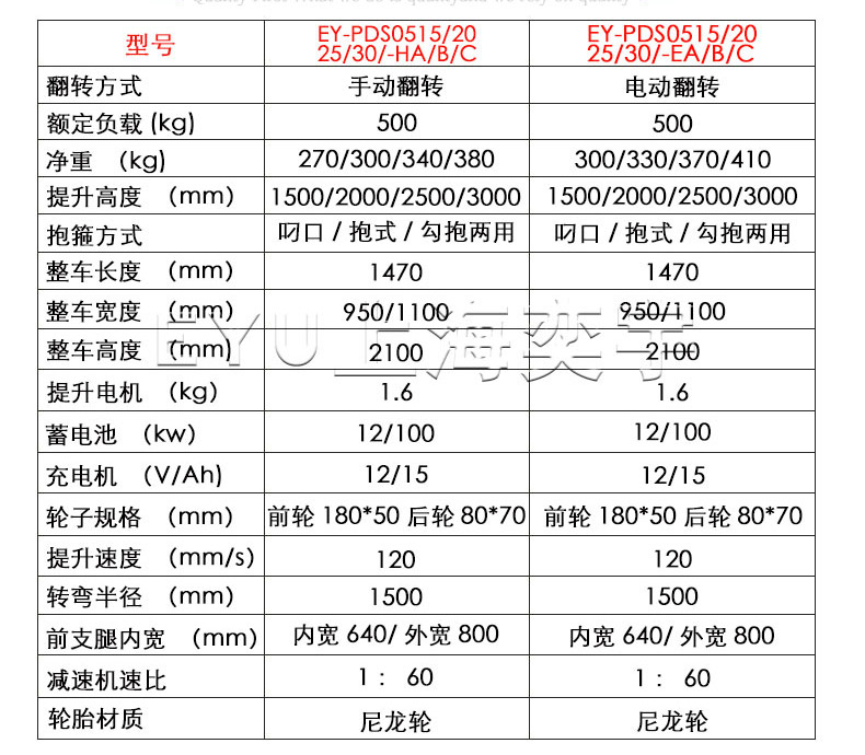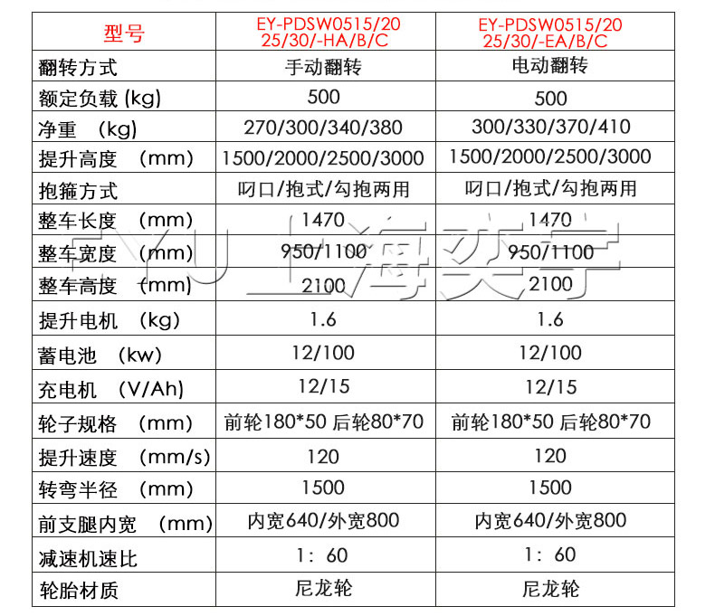 EY-PDS0515系列半電動油桶翻轉(zhuǎn)車詳細(xì)參數(shù):
