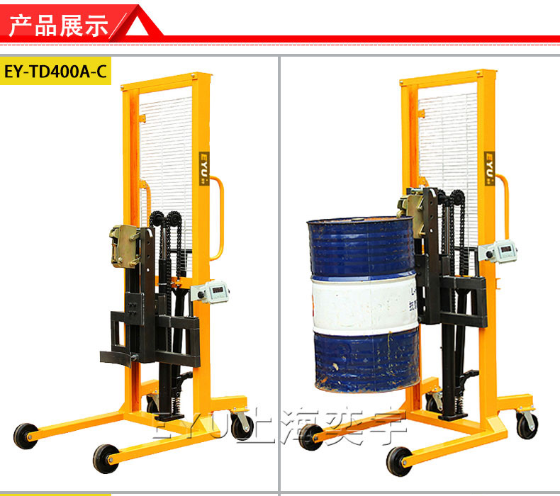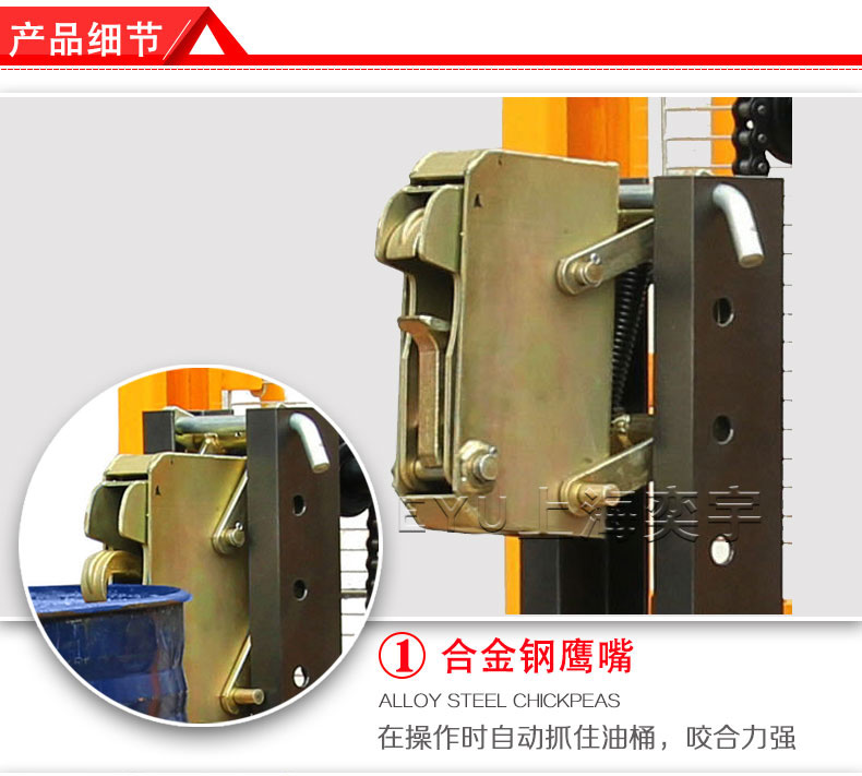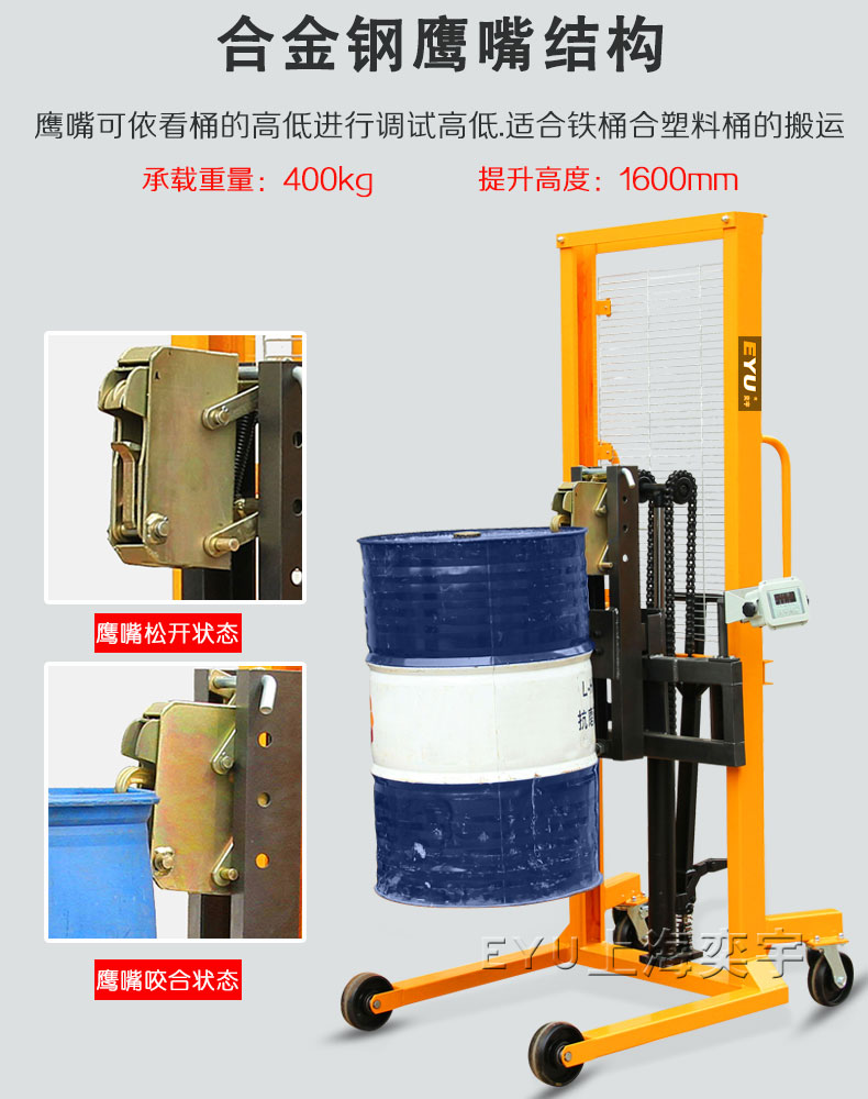 3.叼扣式鷹嘴結(jié)構(gòu),適合鋼制油桶和塑料油桶,高質(zhì)量油缸,起升高度能達(dá)到1600mm