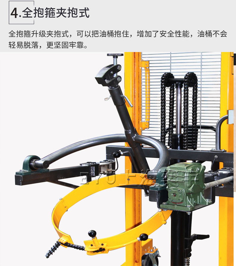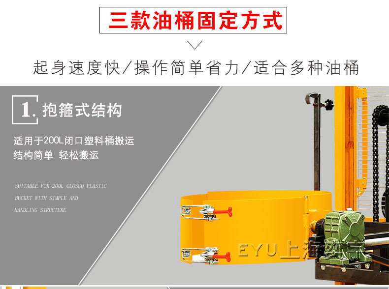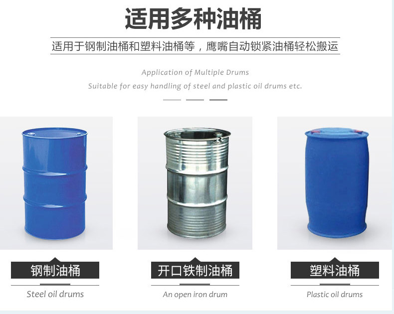 1.抱箍式,適合200L閉口塑料油桶,手動翻轉(zhuǎn)180度;