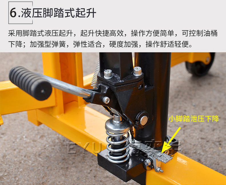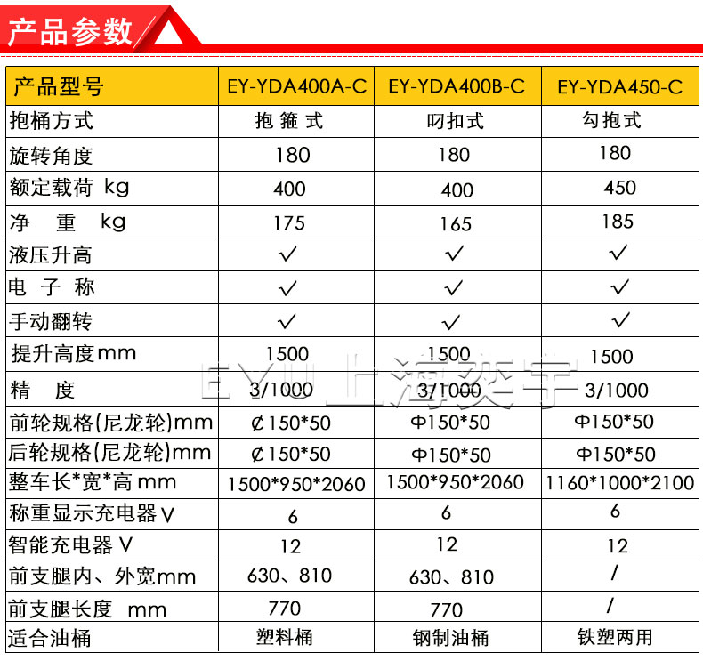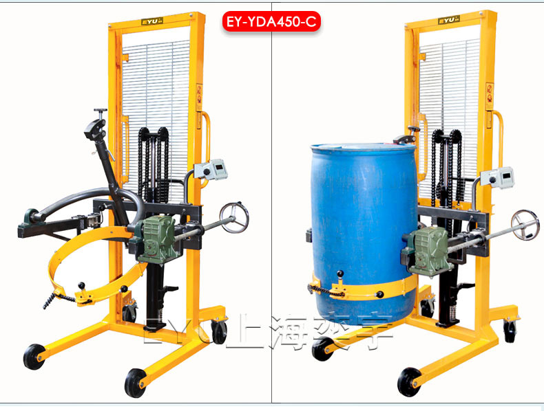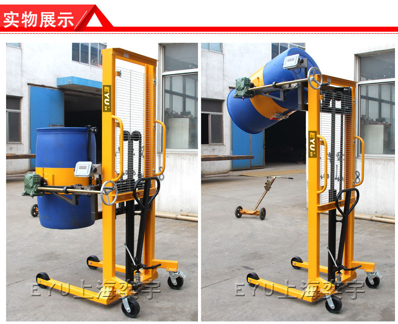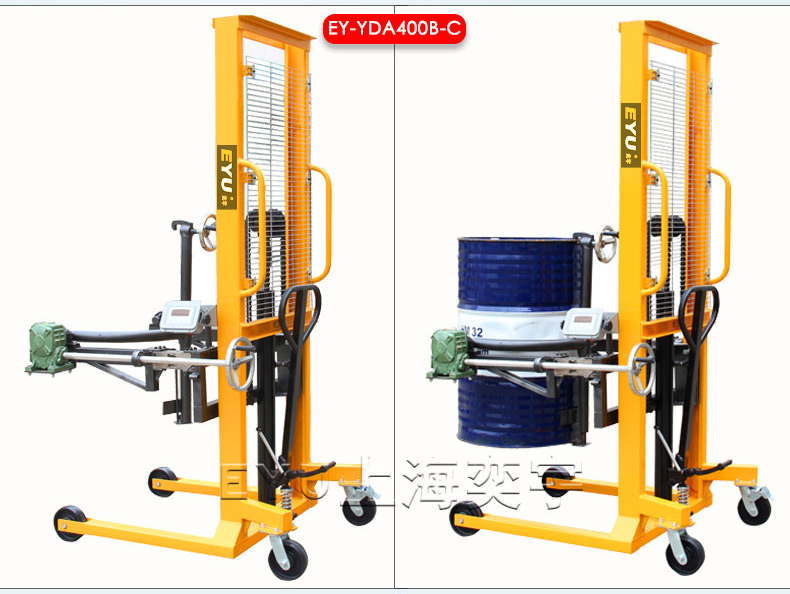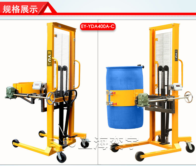 產(chǎn)品賣點:帶稱重功能油桶翻轉(zhuǎn)車有三款:EY-YDA400A-C叼扣式用于鐵桶400kg,EY-YDA400B-C抱箍式用于塑料桶450kg EY-YDA450-C夾抱式鐵塑兩用載重450kg三款都是升高1500mm.電子秤設(shè)立在側(cè)面,易觀察,稱重過后,你可以放心升高,內(nèi)部傳輸稱重數(shù)據(jù),升高降低,不影響稱重。適合油桶搬運、升高、稱重、倒料使用。