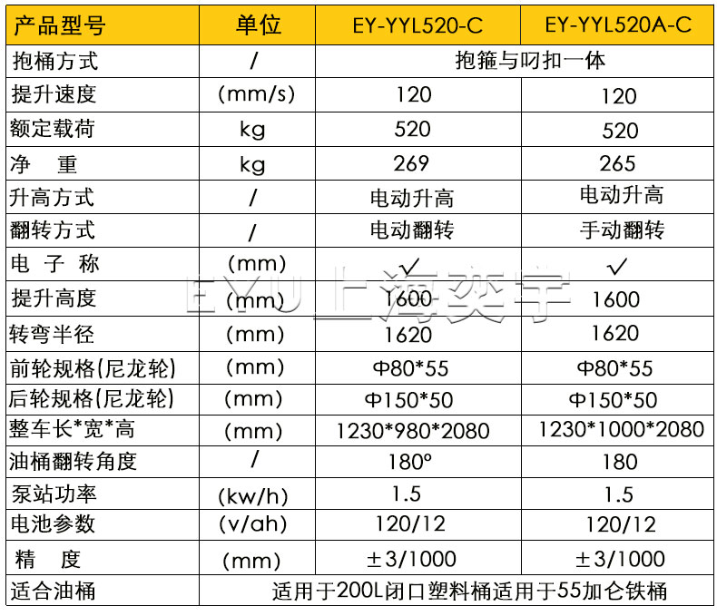 EY-YYL520-C帶電子秤手動傾倒油桶車詳細(xì)參數(shù):