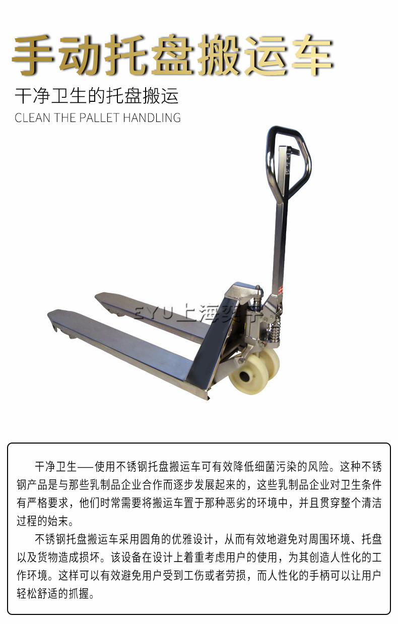 不銹鋼手動(dòng)液壓搬運(yùn)車除了車輪子以及密封件以外,其他所有零部件均由不銹鋼制作。如油缸、車架、手柄、推桿、軸承、插銷等;使產(chǎn)品有很強(qiáng)的抗腐蝕能力,適用于冷庫及潔凈度、抗腐蝕性要求比較高的場(chǎng)所,如肉類加工、奶制品加工、食品加工、 水產(chǎn)品加工和高熱、潮濕的環(huán)境使用。