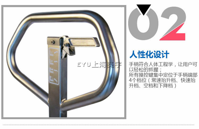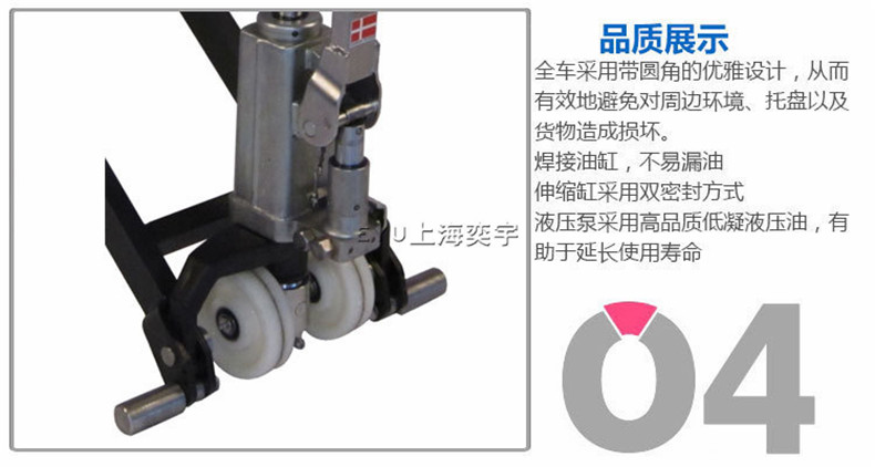 ? 所有零部件材質(zhì)都為不銹鋼,包括液壓泵,貨叉框架,手柄,推桿,軸承,銷和螺栓,等等。