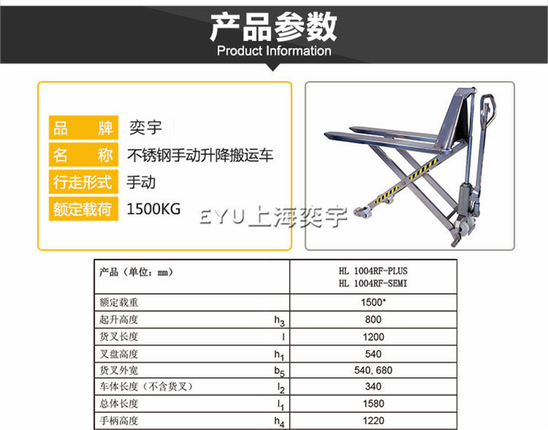 不銹鋼手動(dòng)液壓剪叉式高起升搬運(yùn)車參數(shù):