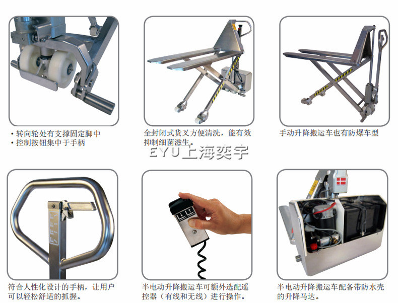 ? 多年生產(chǎn)不銹鋼手動托盤搬運(yùn)車的豐富經(jīng)驗(yàn),奕宇為客戶呈獻(xiàn)質(zhì)量可靠,持久耐用的搬運(yùn)車產(chǎn)品。無論是在屠宰場、魚品加工場,還是在化工/制藥行業(yè),奕宇不銹鋼手動托盤搬運(yùn)車總能提供恰如您需要的服務(wù)。